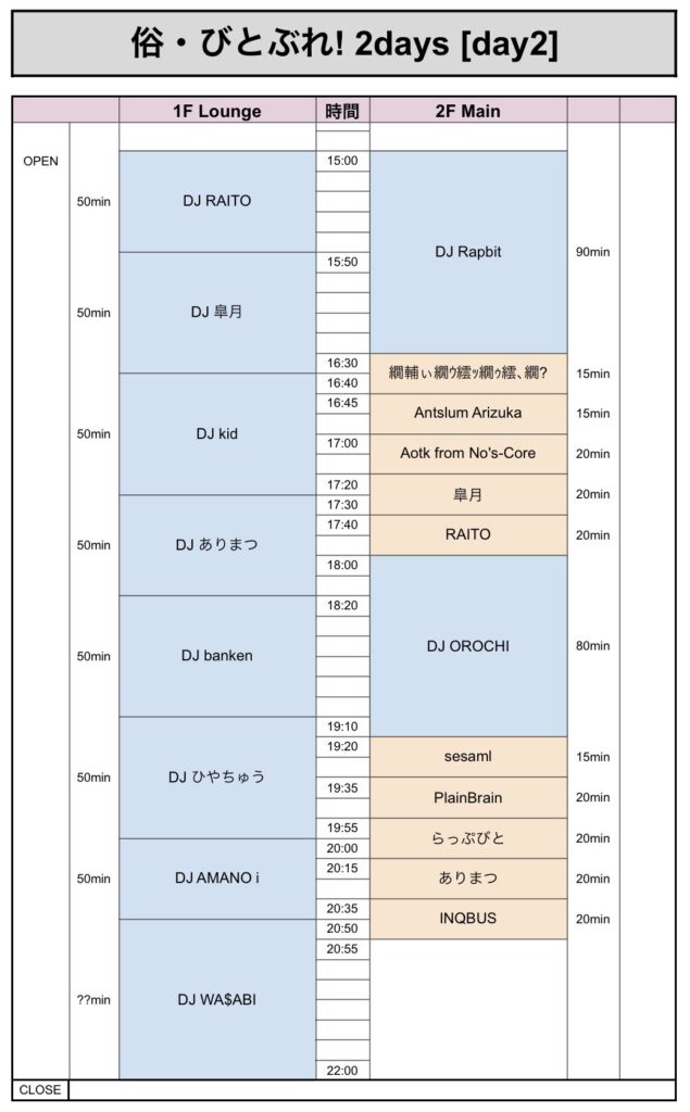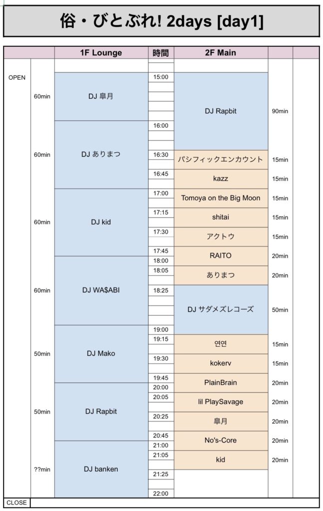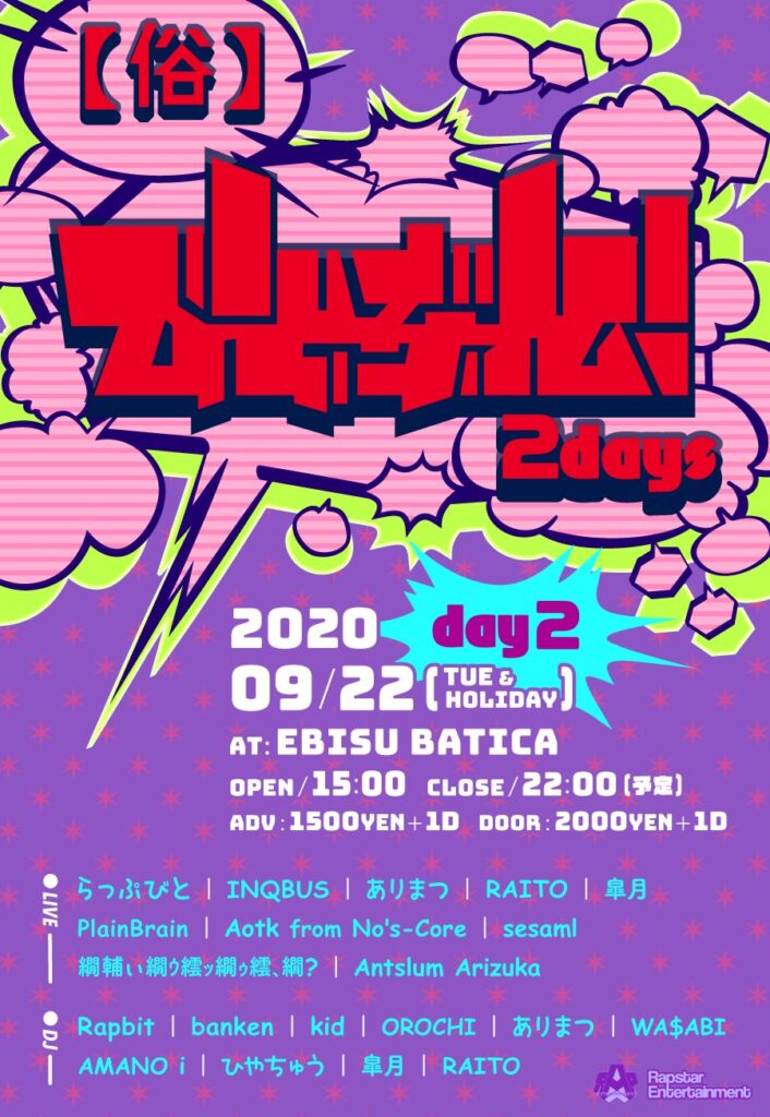 ARCHIVE俗・びとぶれ! 2days 2020年8月29日 2020年8月29日 Facebook Twitter はてブ Pocket Feedly らっぷびとが主宰を務めるRapstar Entertainmentがお送りするLive&DJのオールジャンルイベント「俗・びとぶれ! 2days」日程:2020年9月21日(月・祝)&22日(火・祝)場所:Ebisu BATICA時間:OPEN 15:00 / CLOSE 22:00 (予定)価格:Adv 1,500+1D / Door 2,000+1D Facebook Twitter はてブ Pocket Feedly